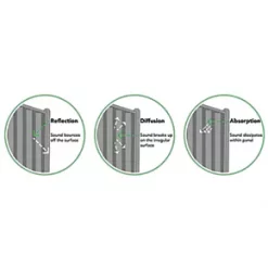 Domestic panel with effective noise reduction performance. Boards interlock with extended tongue and grooves and are mounted in a rebated frame to ensure that there are no gaps across the face of the board that would allow noise to pass through, reflecting unwanted noise. Triform technology used in the production of the boards on the panel gives each board a triangular profile on each side of the panel which helps to further diffuse noise as sound waves hit multiple faces and break up. Reduces noise levels by up to 30dB.
