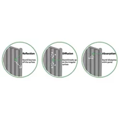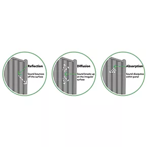 Domestic panel with effective noise reduction performance. Boards interlock with extended tongue and grooves and are mounted in a rebated frame to ensure that there are no gaps across the face of the board that would allow noise to pass through, reflecting unwanted noise. Triform technology used in the production of the boards on the panel gives each board a triangular profile on each side of the panel which helps to further diffuse noise as sound waves hit multiple faces and break up. Reduces noise levels by up to 30dB.