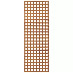 Decorative square trellis featuring tightly spaced battens for an attractive, contemporary look. The battens are 15mm thick and 30mm wide and have been dip-treated with a preservative to protect the trellis from rot and give it a golden brown colour.