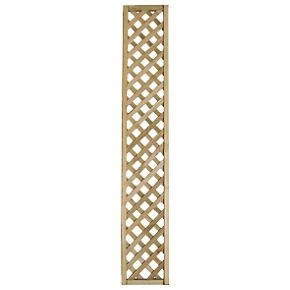 Pressure-treated decorative trellis with an attractive diamond pattern. Features square-edged, smooth-planed battens that are 6mm thick and 30mm wide. Battens are overlaid and mounted in a substantial rebated perimeter frame (also smooth-planed). Designed primarily for mounting to an external wall, or fence, to create a garden feature that can support climbing plants.