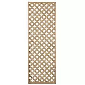 Pressure-treated decorative trellis with an attractive diamond pattern. Features square-edged, smooth-planed battens that are 6mm thick and 30mm wide. Battens are overlaid and mounted in a substantial rebated perimeter frame (also smooth-planed). Designed primarily for mounting to an external wall, or fence, to create a garden feature that can support climbing plants.